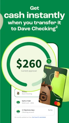 1-Dave is not a bank. Banking services provided by Evolve Bank and Trust, Member FDIC, or another partner bank, which issues the Dave Debit Card through a license from Mastercard®. ExtraCash amounts range from $25-$500, typically approved in 5 min, with an overdraft fee equal to the greater of $5 or 5%. Multiple overdrafts may be required. Not all members qualify for ExtraCash and few qualify for $500. ExtraCash is repayable on demand. Must open an ExtraCash overdraft deposit account and Dave Checking account. Up to $5 monthly membership fee for ExtraCash, Income Opportunity Services, and Financial Management Services. Optional 1.5% fee for external debit card transfers.