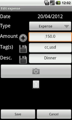 Expenses can be recorded either by input form or by taking a picture of the receipt.
