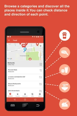 • Category Search: Allows you to find nearby places from specific categories such as banks, health, food, shopping, art, entertainment, etc.